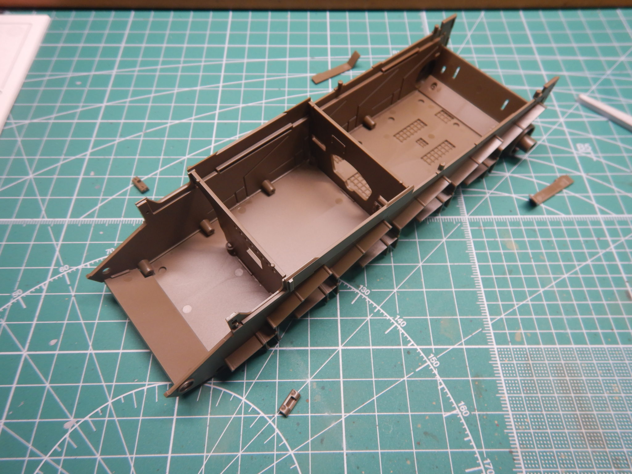 ここまで組み立てて塗装に入りました。下地塗装のサーフェーサーはグレーを選択しました。履帯のフェンダーはこの時点では接着していません。