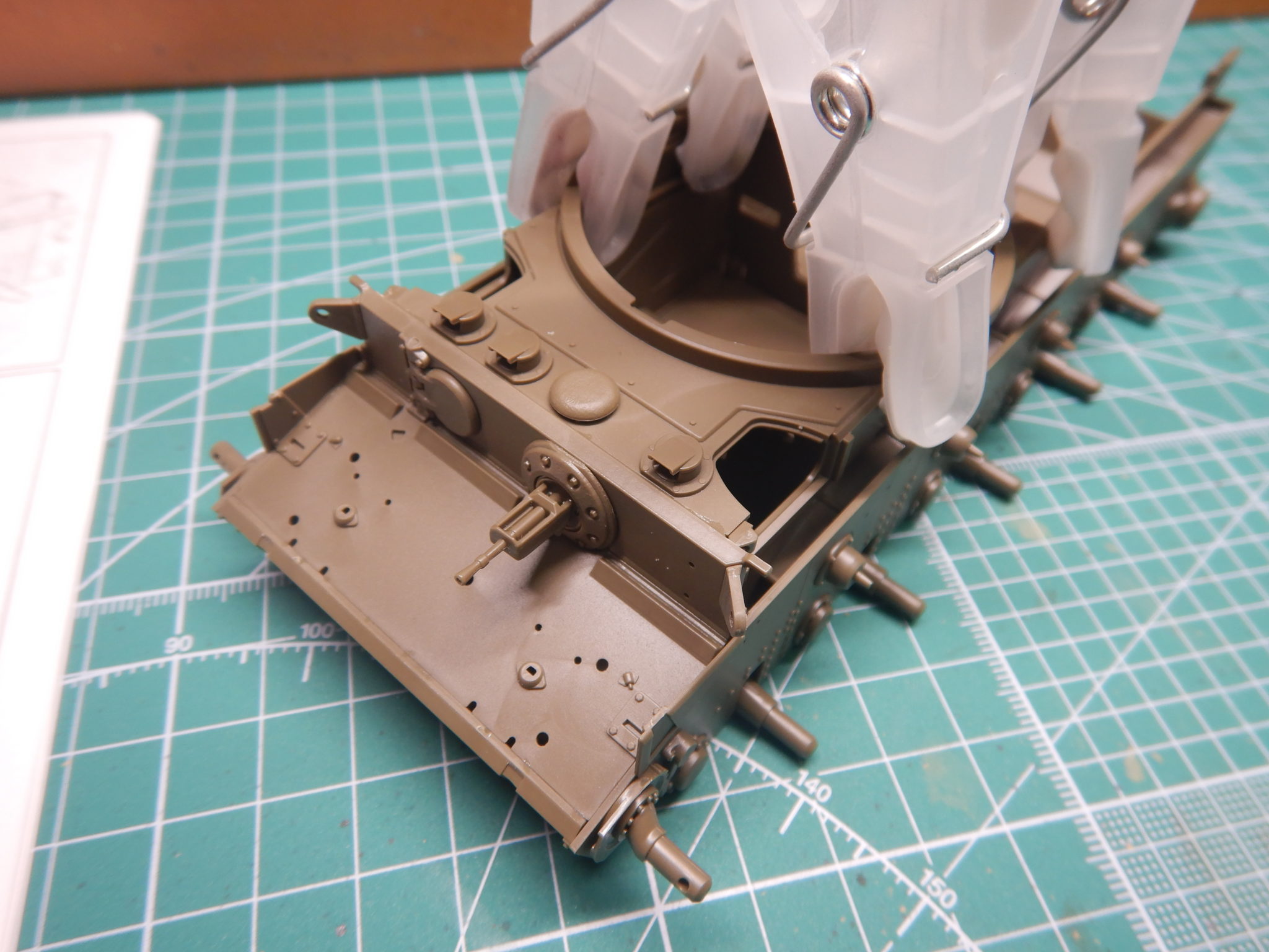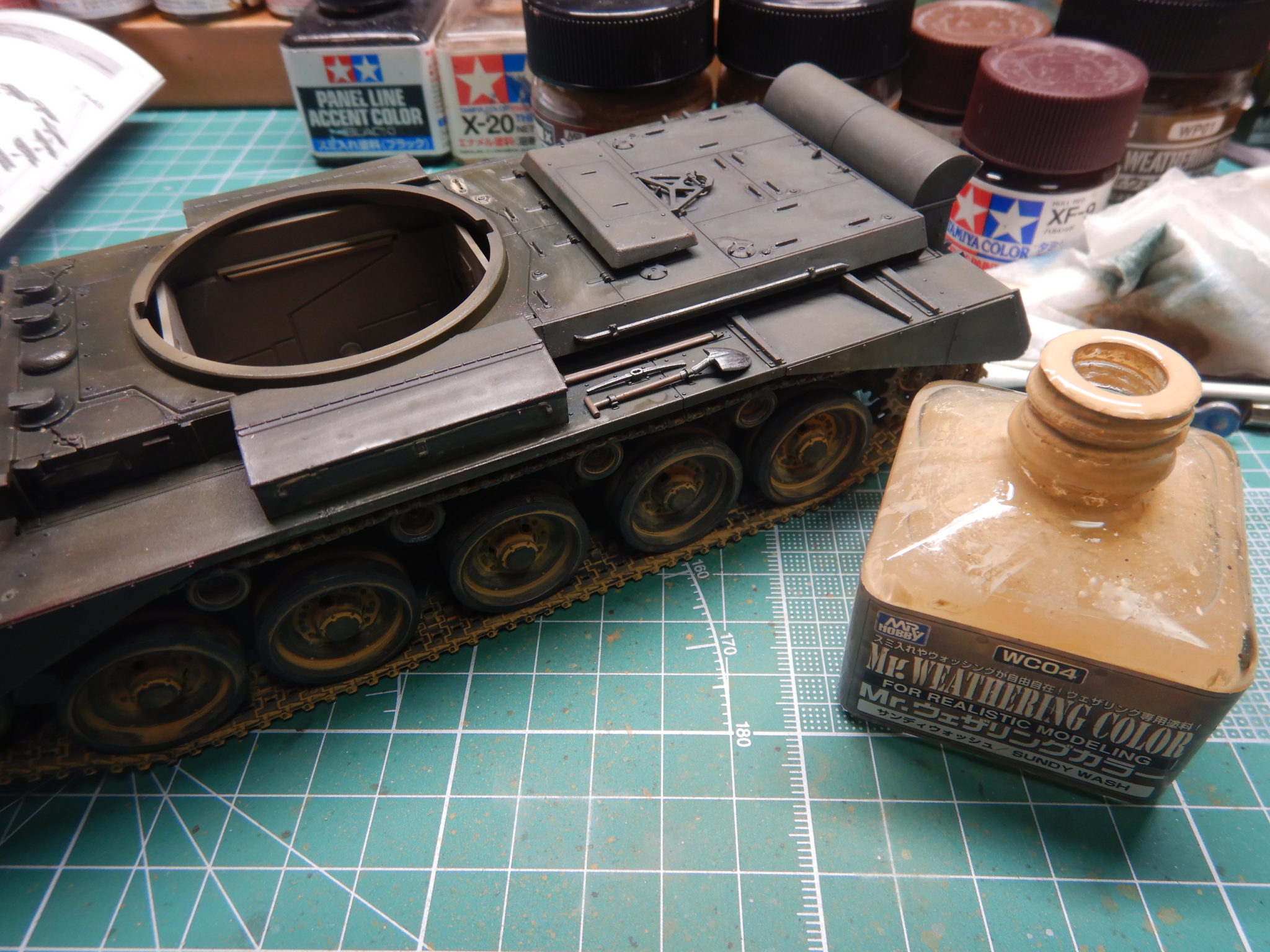 ある程度ウェザリング塗装を行ったあとに、転輪と履帯を車体に取り付けました。このあと、ウェザリングパステルで汚しに変化をつけています。