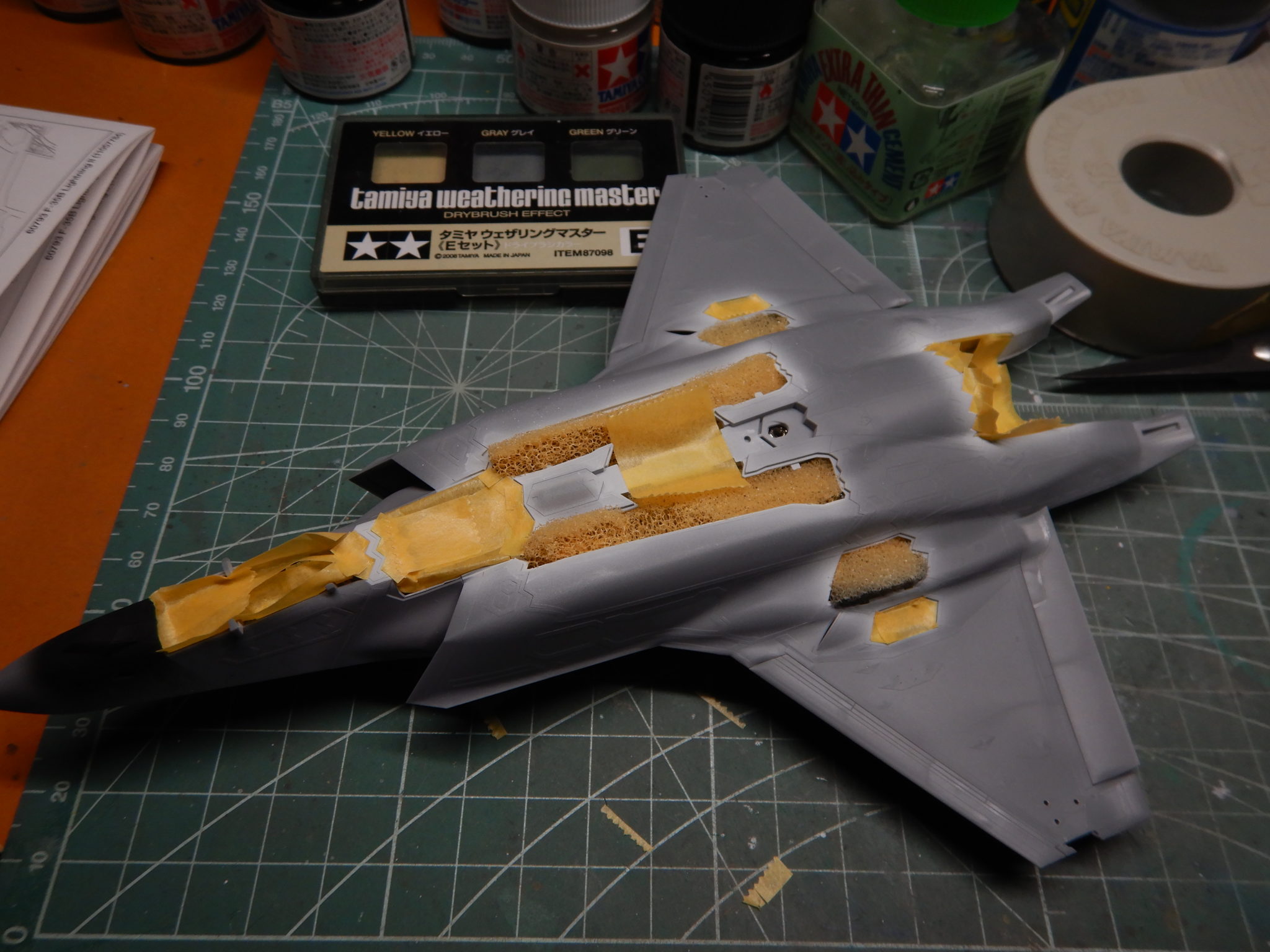 タミヤから(ほぼ)F-35シリーズの専用色であるLP-85カモフラージュグレイとLP-85ミディアムエアーグレイが発売されました。以前の作例ではこの塗料はまだ発売されておらず、別の塗料を混色して作成していたので、非常に塗装は楽になりました。