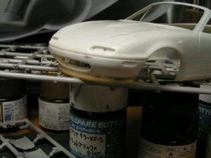 実車はエアロパーツや数々のチューニングが施されているため、可能な限り再現を試みています。エアロパーツはエポキシパテを盛って作っています。フロントスポイラーの穴はパテ硬化後、リューターで穴を開けています。