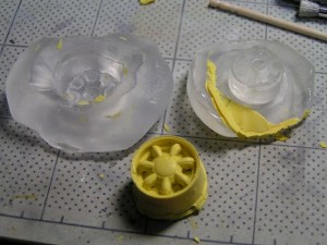 こんな感じで雄型と雌型を作ります。型が硬化した後、ポリパテを流しこみます。(本格的にやるならば、シリコンゴムで型を採って、レジンを流すところなのでしょうが、それらはかなり高価なので低予算でやるならこれが良いのかも知れません。)