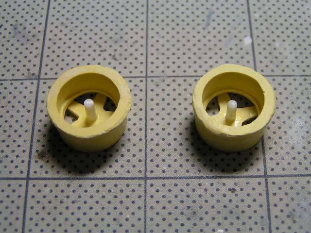 ディスク無しのホイールを4個と、ディスク2種類2組を更に複製します。文にすると簡単そうなのですが、やはりポリパテが旨く流れ込まなかったりして、何 度も失敗しています。成功率は50%位でしょうか?(^^;軸は、プラ材を接着していますが強度を確保するために真鍮線を埋め込んでいます。